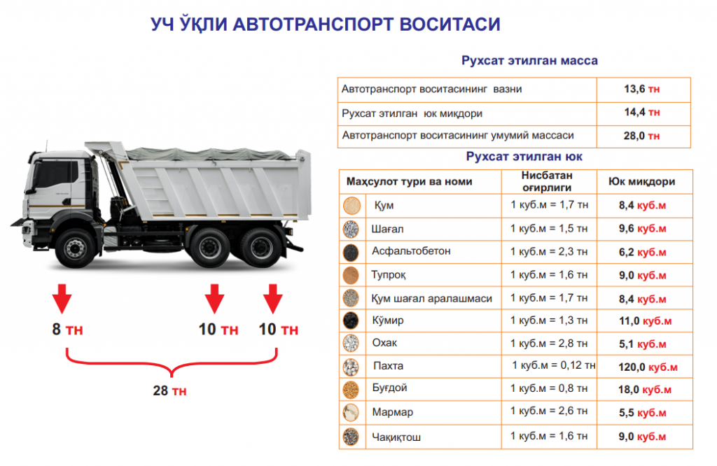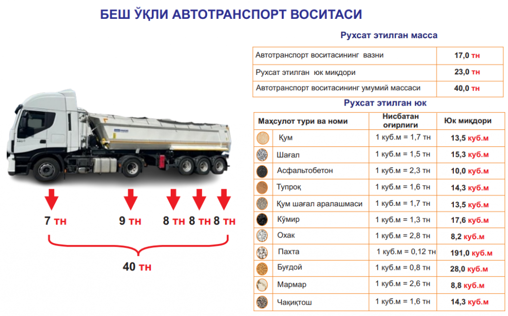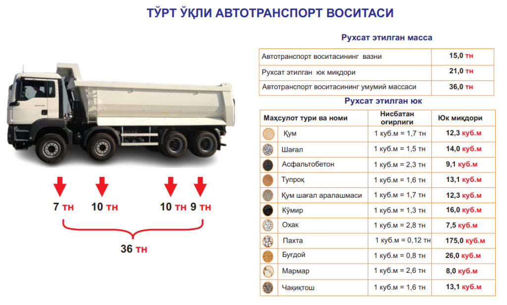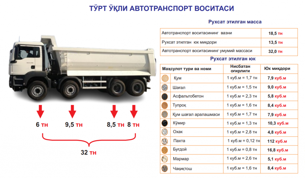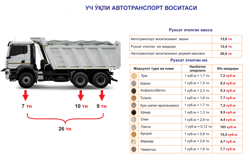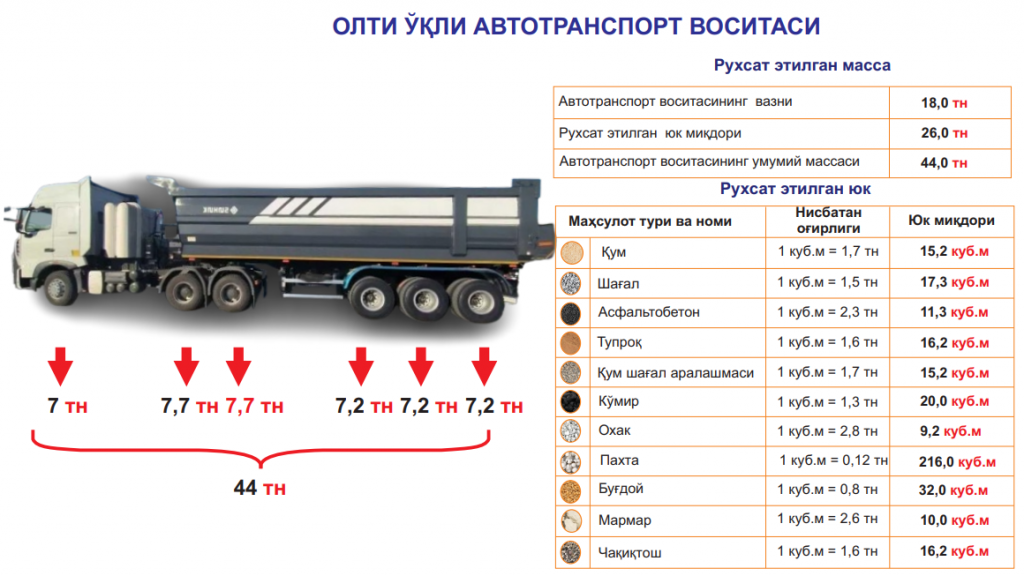 УЧ ВА ОЛТИ ЎҚЛИ (МИНГАШМАЛИ) АВТОТРАНСПОРТ ВОСИТАЛАРИНИНГ РУХСАТ ЭТИЛГАН МАССАСИ