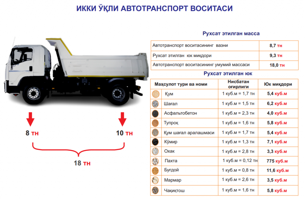 Изоҳ: Автотранспорт воситаларининг ҳар бир ўқига тушувчи рухсат этилган оғирлиги автотранспорт воситаларининг умумий рухсат этилган массасига риоя қилинганда 10 тоннадан ортиқ бўлмаслиги керак.